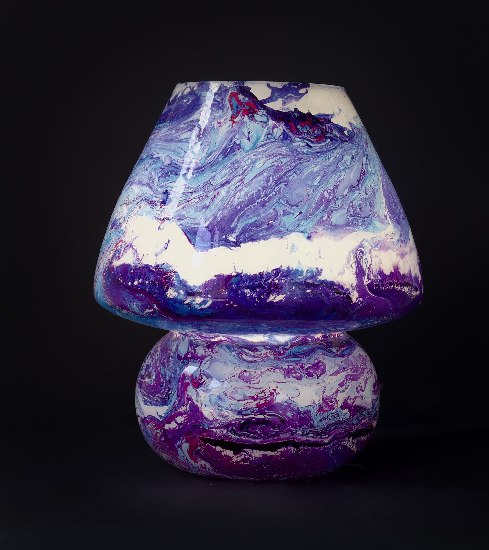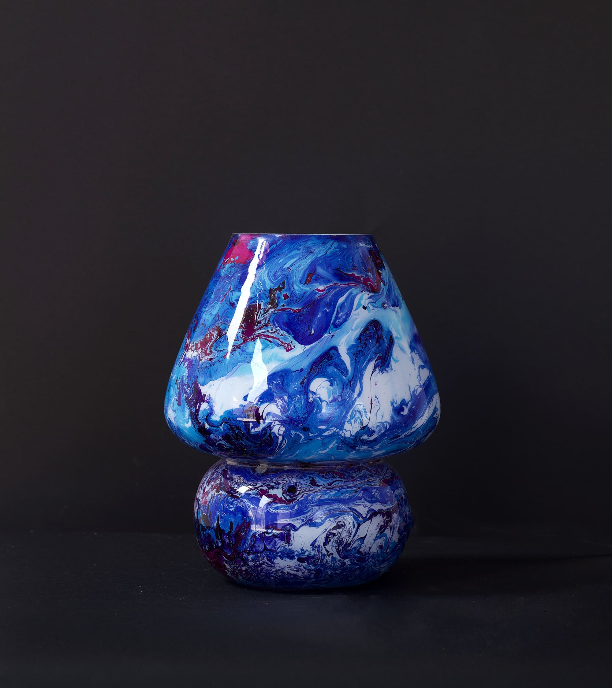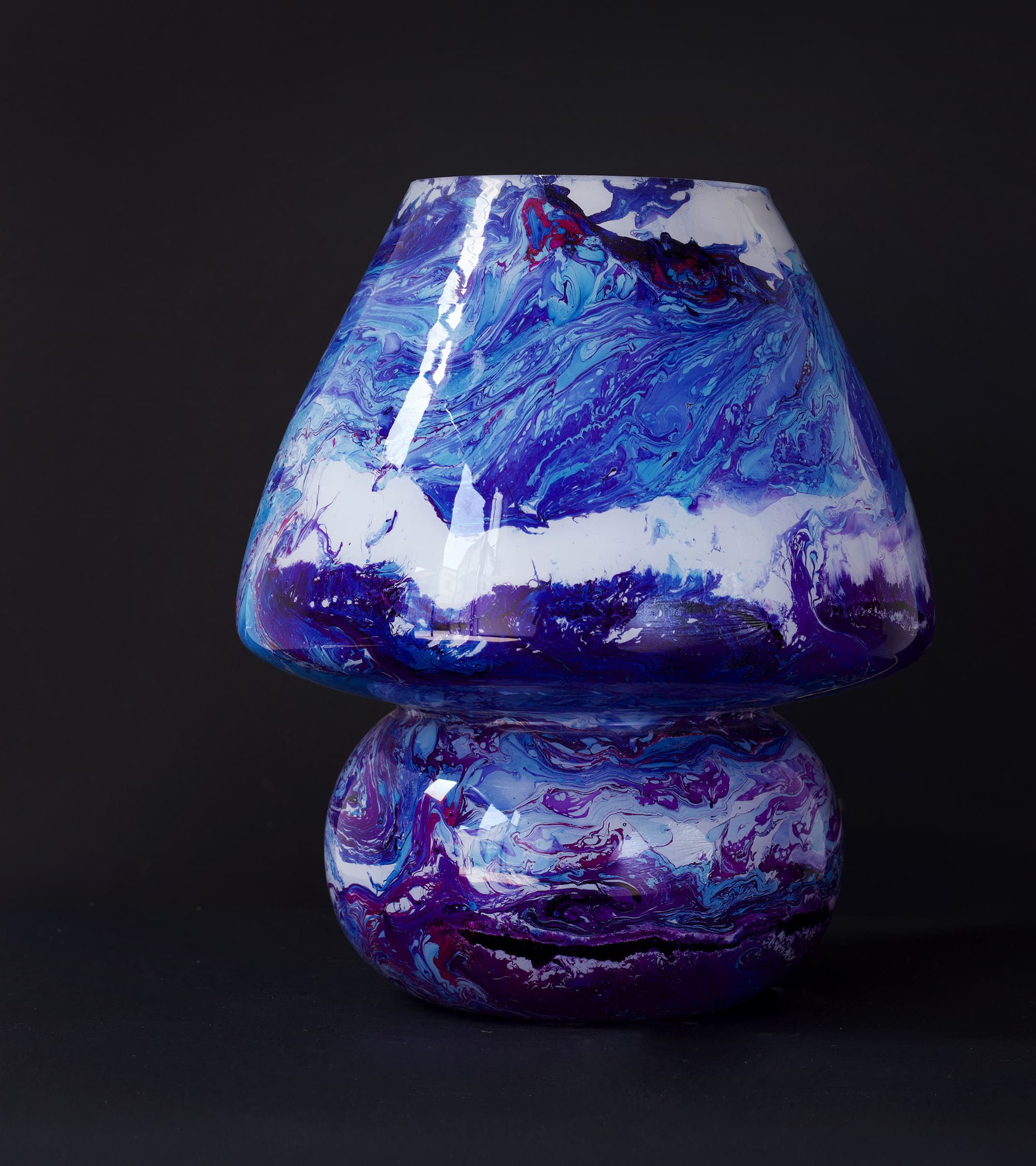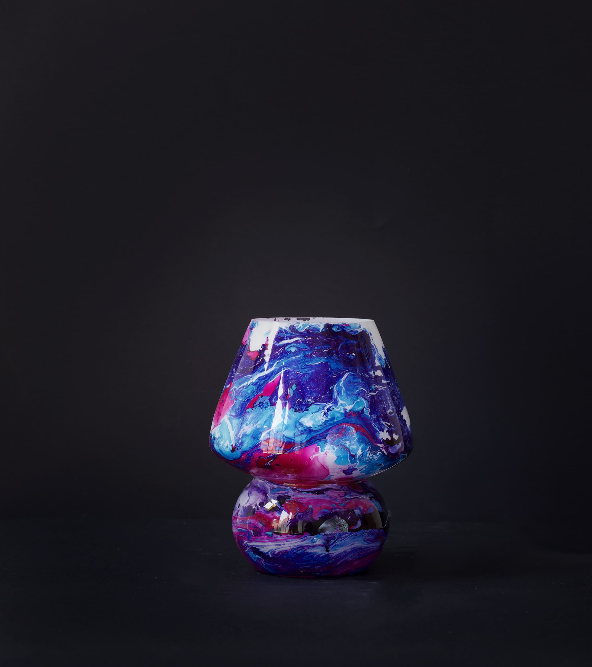 The Supernova lamps capture this sacred moment between chaos and creation. Their glass forms seem to pulse with energy, saturated in deep amethyst and hints of indigo fading into white. Each lamp is like a frozen explosion, captured mid-bloom. No two are the same, just as no supernova ever repeats its shape.