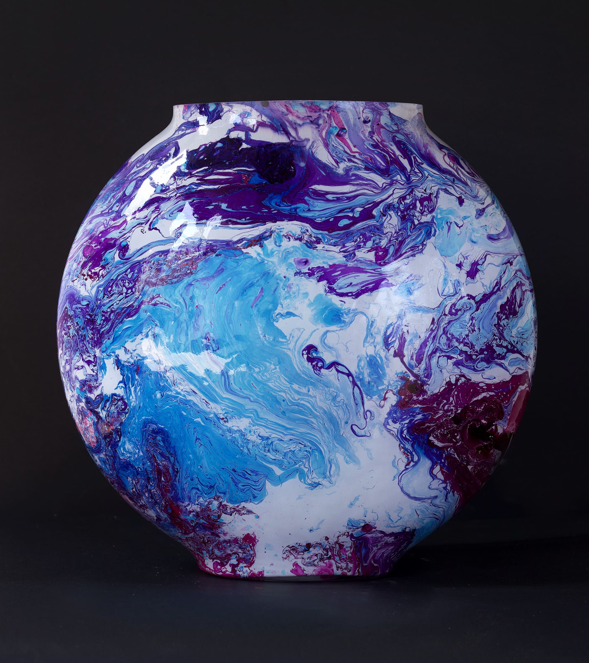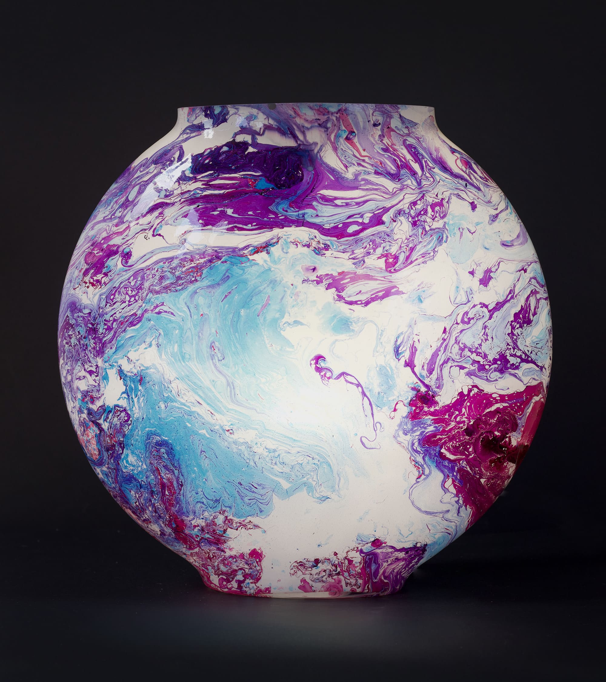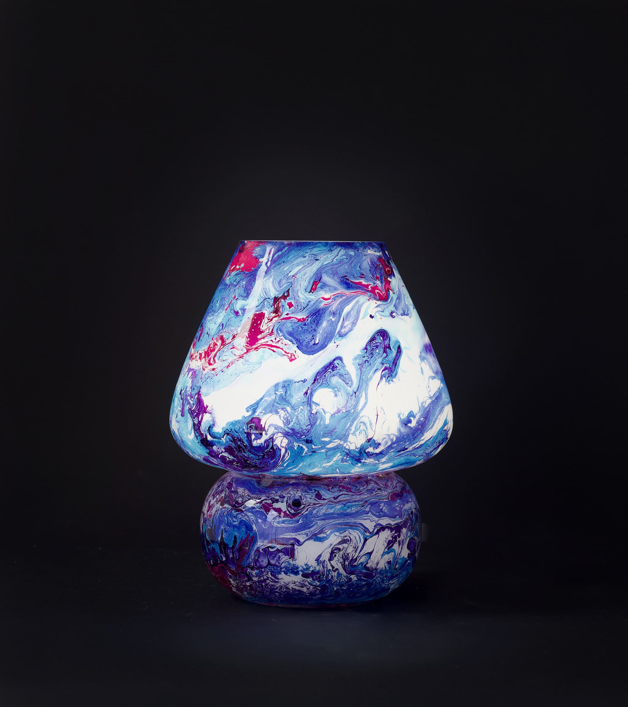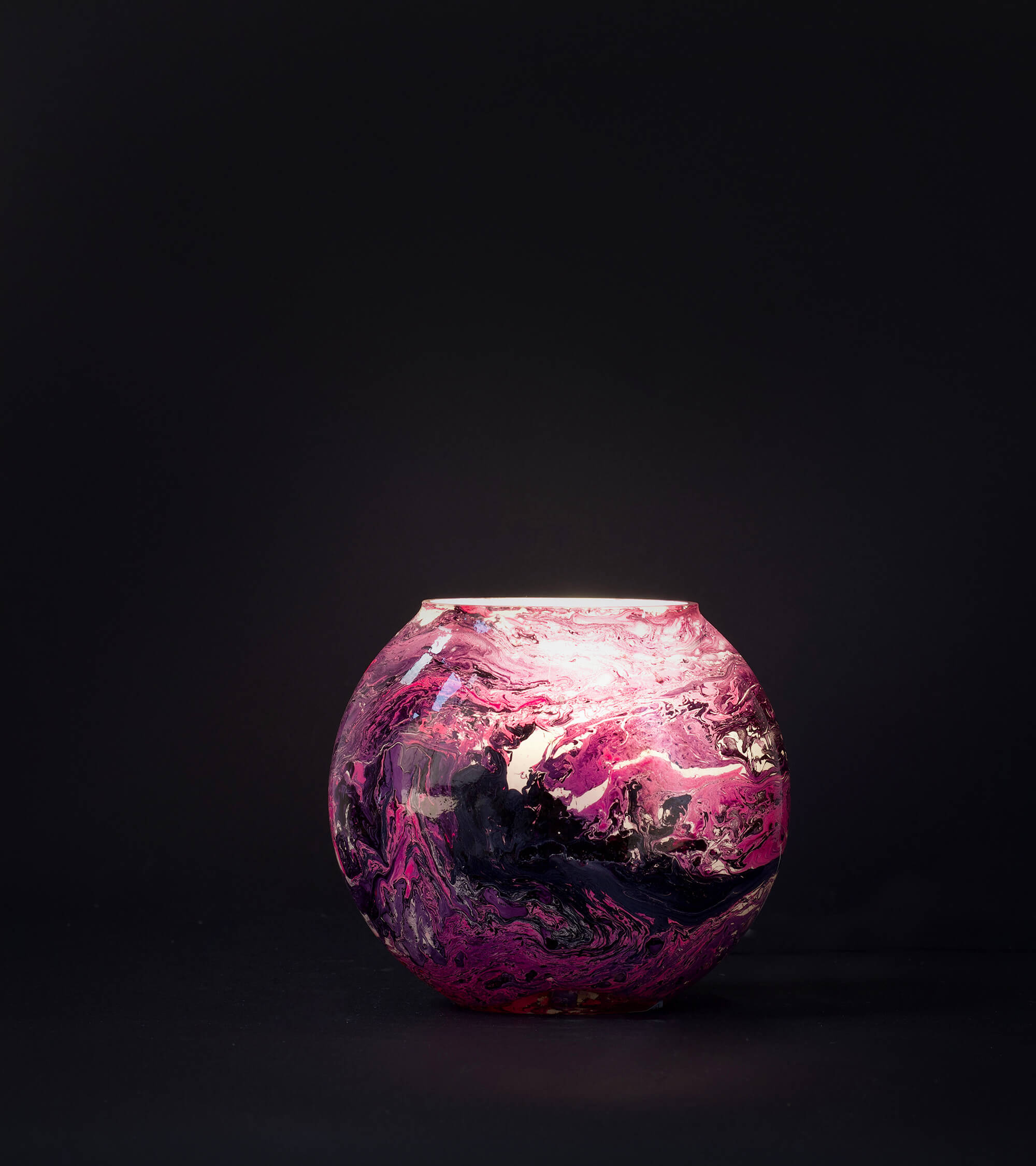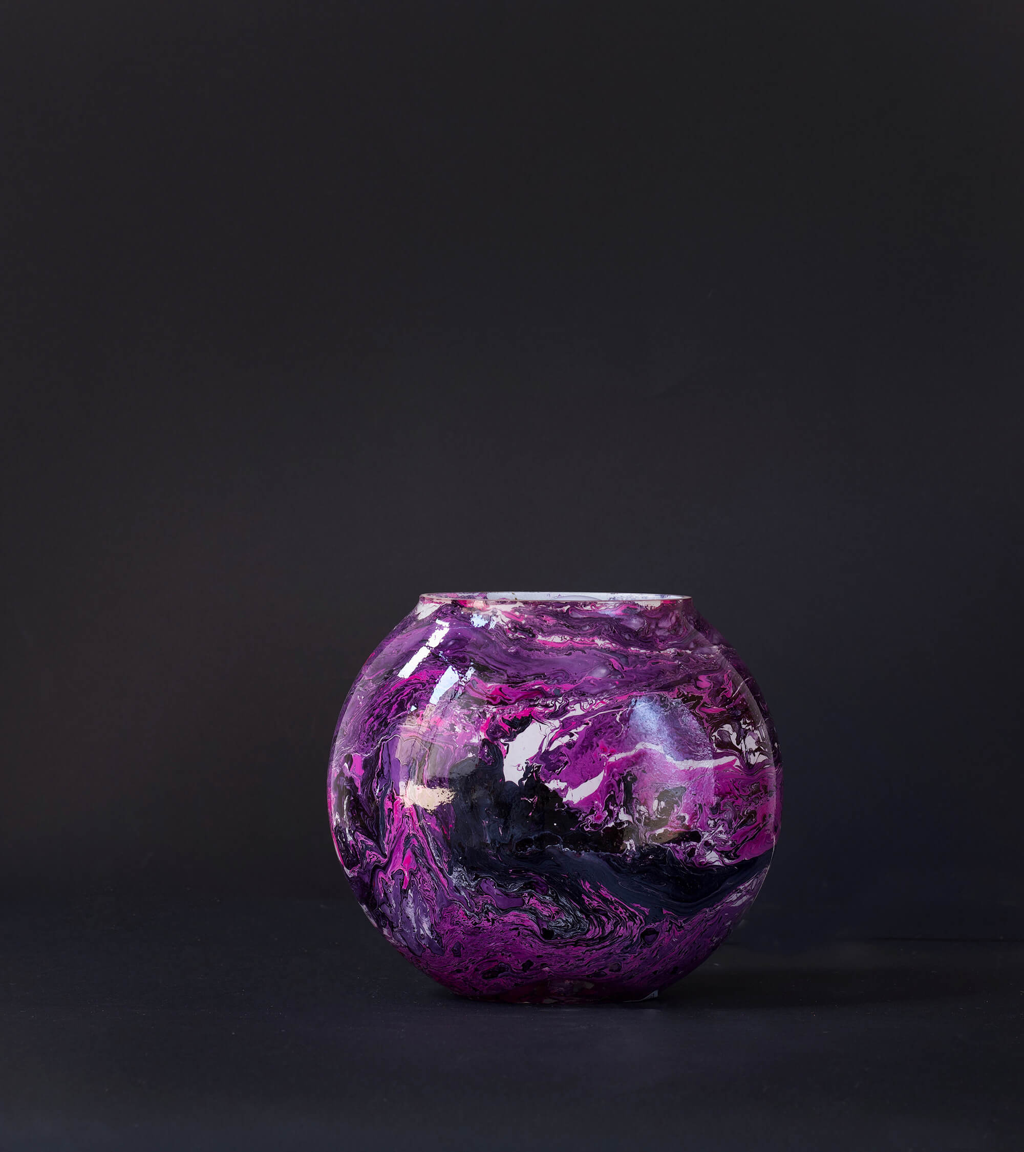 The Supernova lamps capture this sacred moment between chaos and creation. Their glass forms seem to pulse with energy, saturated in deep amethyst and hints of indigo fading into white. Each lamp is like a frozen explosion, captured mid-bloom. No two are the same, just as no supernova ever repeats its shape.